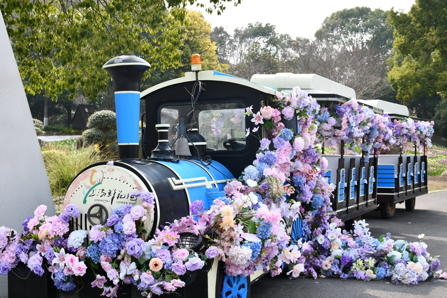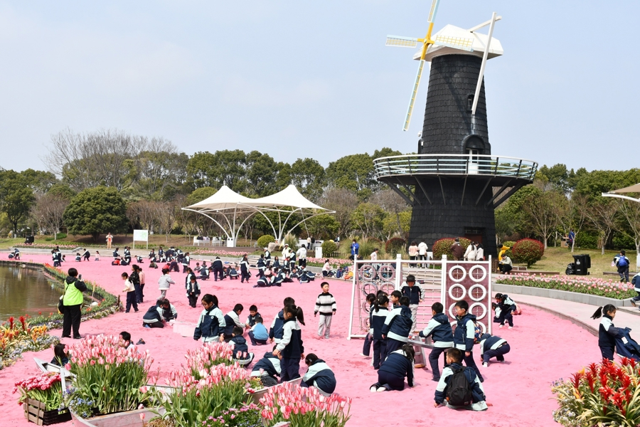 在爱情岛、粉色沙滩区域,精心设计的花艺景观也吸引了众多市民驻足拍照。花海中的秋千、风铃大道上的春风私语以及“开往春天的列车”等氛围营造,让赏花之旅充满了童趣与诗意。