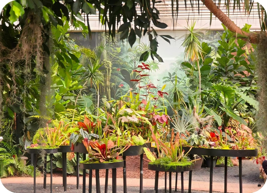 除了室外的郁金香花海,4000平方米的热植园同样令人流连忘返。园内打造了雨林、蝴蝶生态、地中海、食虫植物、多肉、水生等景观,汇聚了从热带雨林到沙漠绿洲的七大特色植物群落,一步一景遍历微型地球。